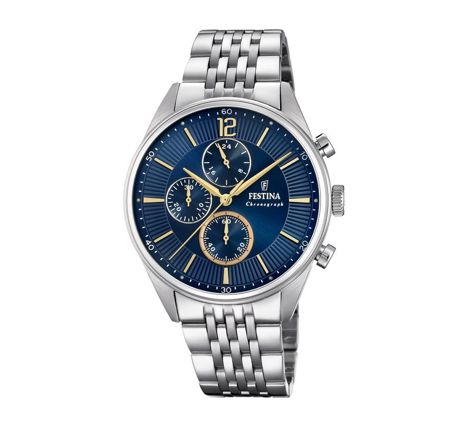 Orologio Festina da uomo della Collezione Timeless Chronograph. Con cassa in acciaio inox da 41mm e vetro minerale, completato da un bracciale in acciaio inox.