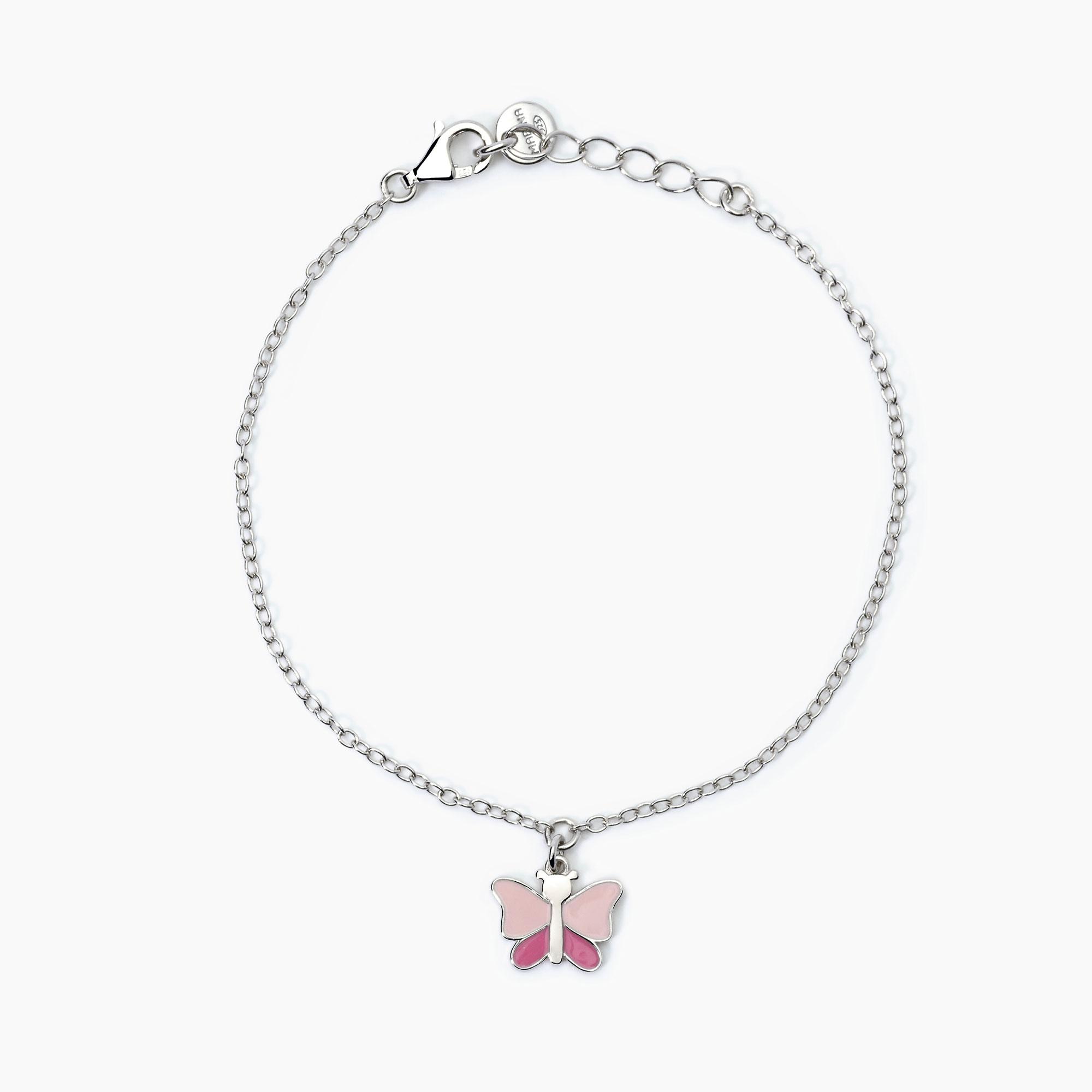 Bracciale bimba regolabile in argento rodiato con catena forzatina e ciondolo farfallina smaltato.