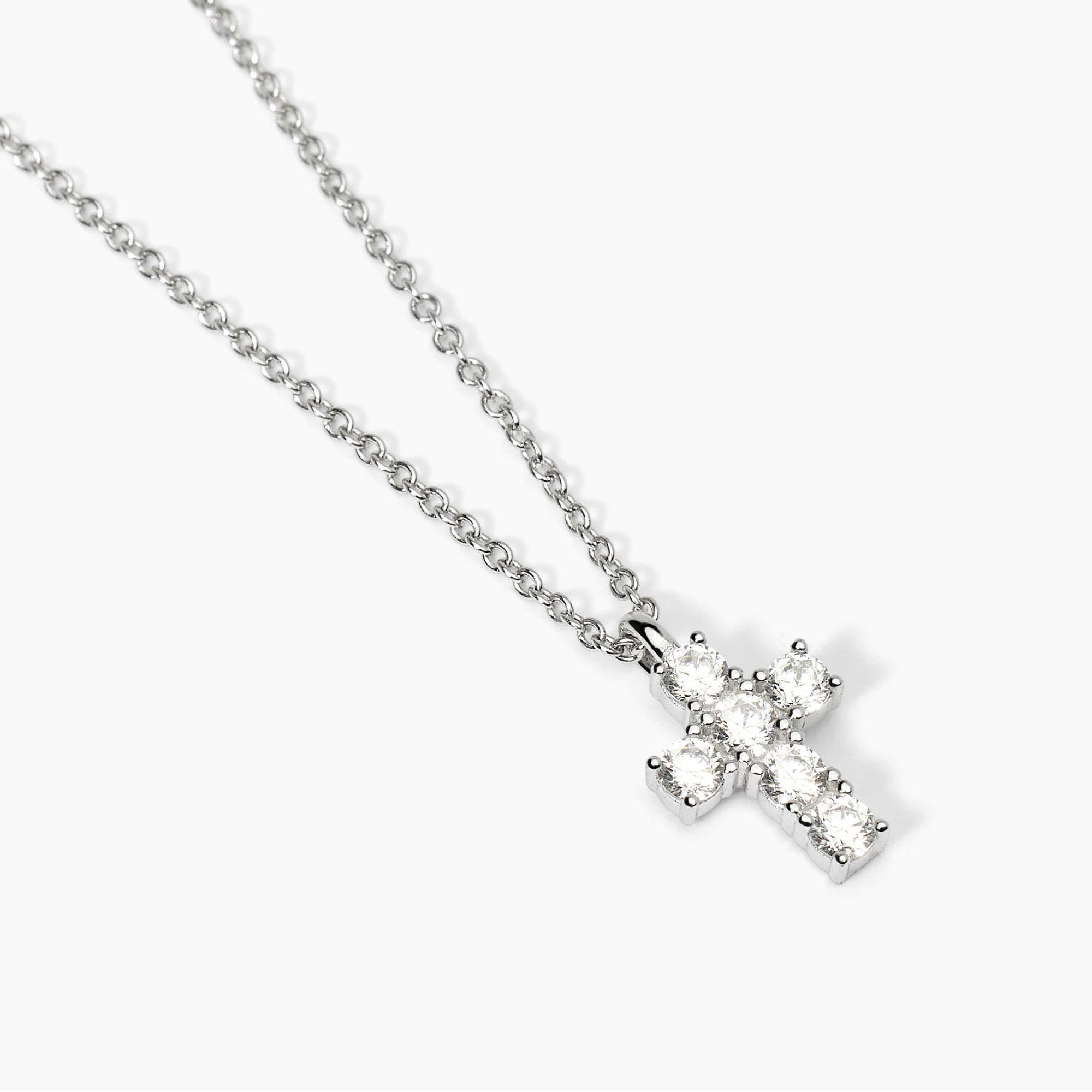 Girocollo regolabile da donna in argento rodiato con catena forzatina, ciondolo croce e zirconi bianchi.