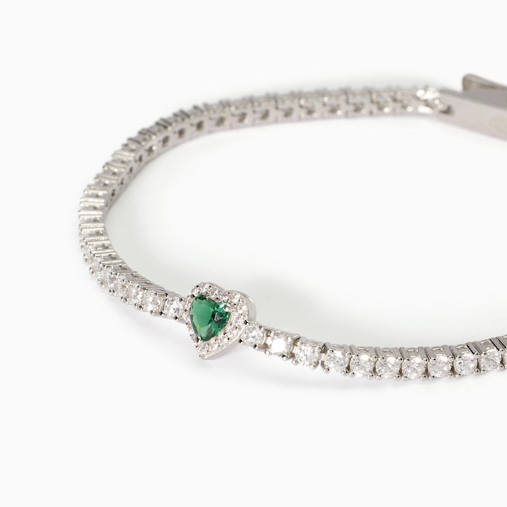 Bracciale Tennis Da Donna In Argento Rodiato Con Smeraldo Sintentico Centrale Taglio Cuore E Zirconi.