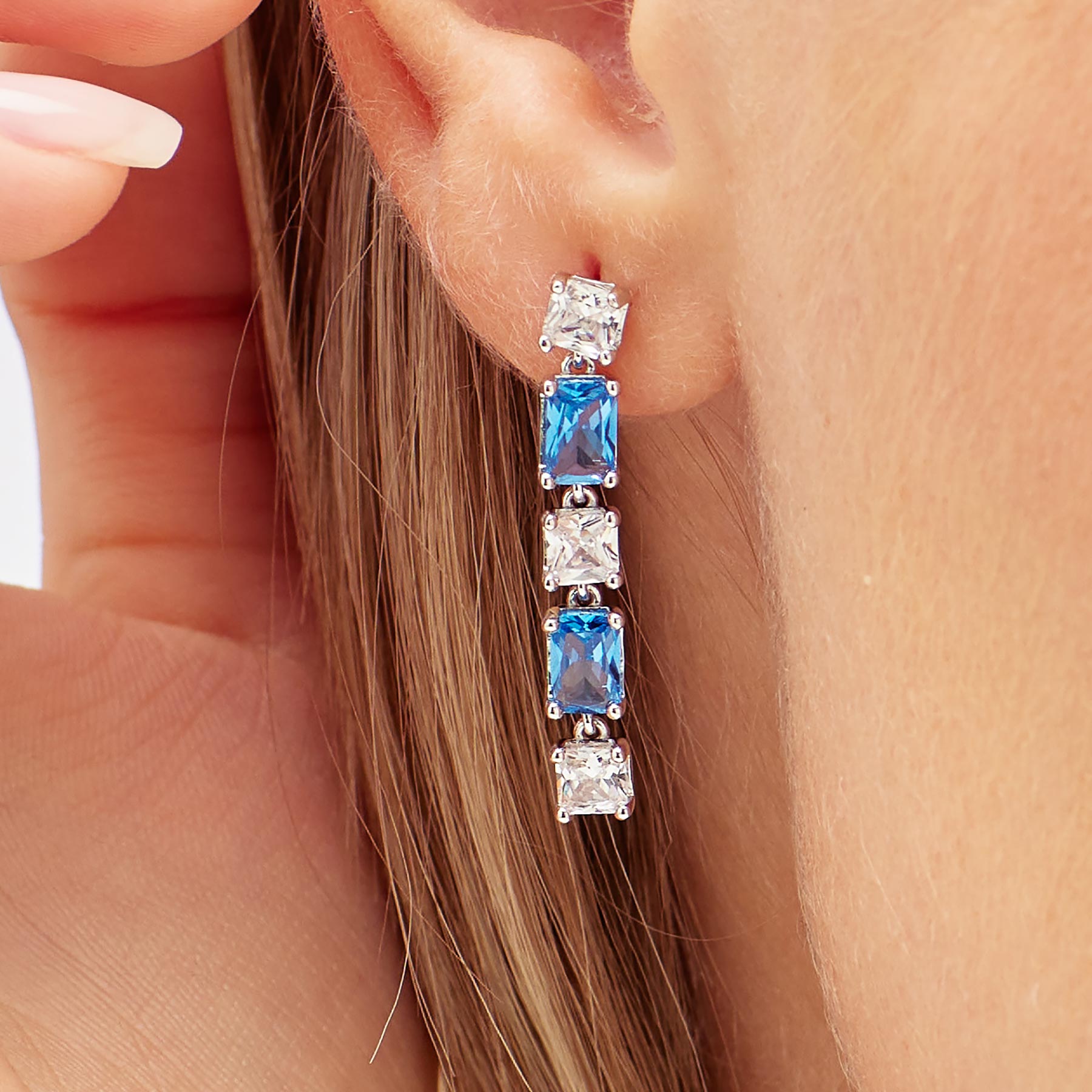 Orecchino Singolo Pendente In Argento Rodiato 925‰ Con Cushion Cubic Zirconia Chiari E Baguette Cubic Zirconia Colore Sapphire.